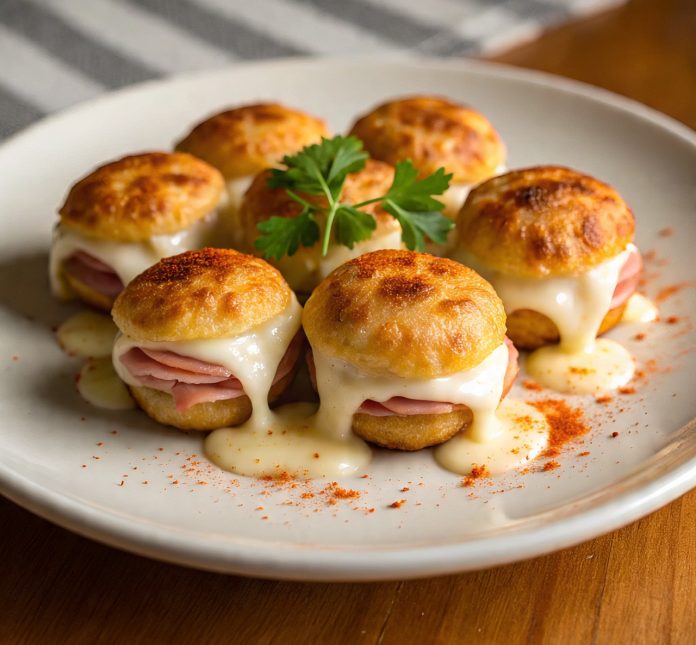 Em cada tira de massa, coloque uma fatia de presunto e uma de queijo.